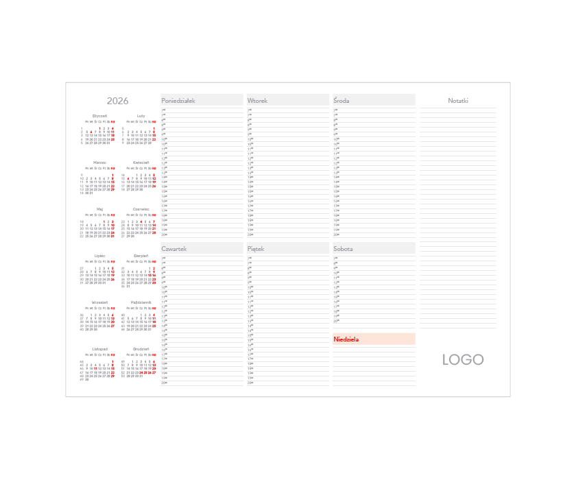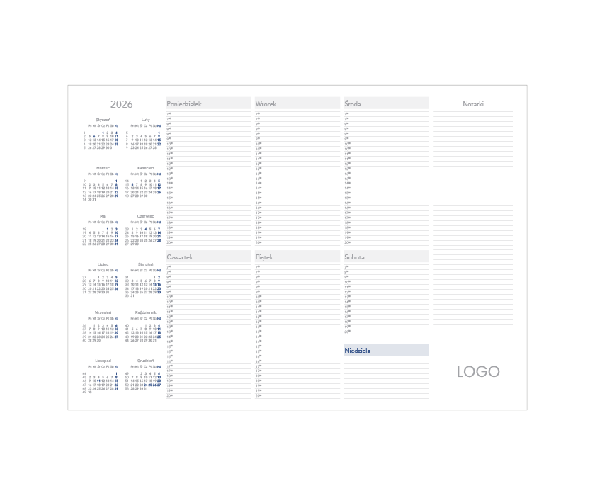 - Kalendarium: język PL, dwie wersje kolorystyczne: