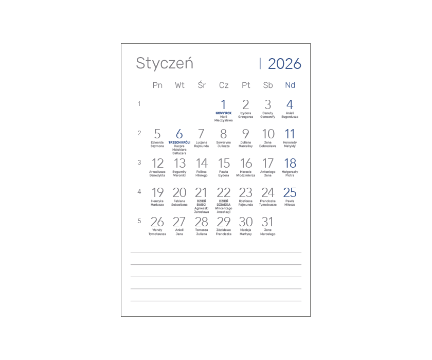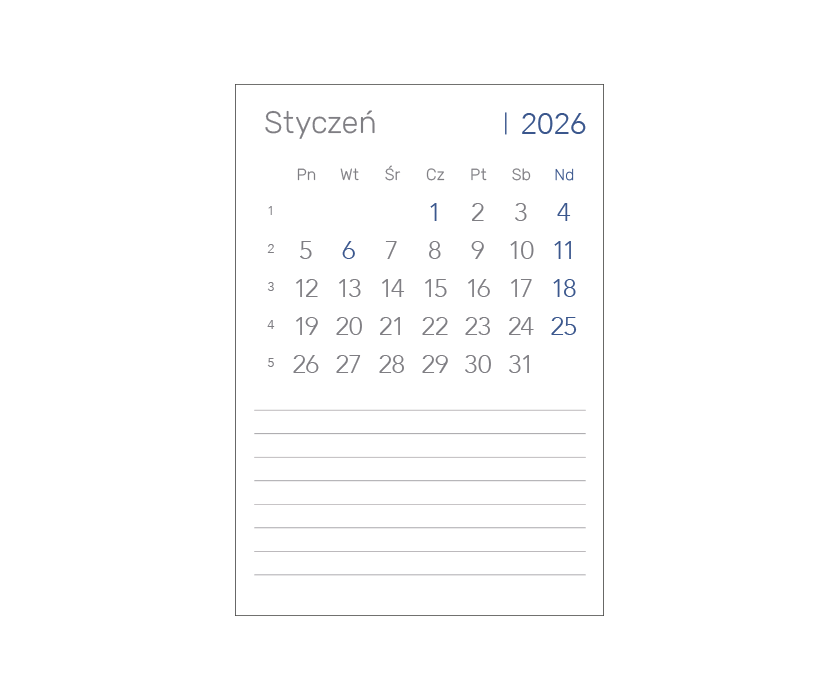 - Kalendarium: 97x140 mm, 12 kart z miesiącami, papier offsetowy biały 80 g, druk cyfrowy CMYK,